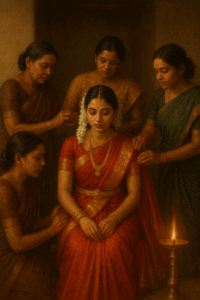 Kamalam bathed and draped herself in a new sari — one that gleamed like a bridal garment. The women of the village gathered around her, adorning her hair with fragrant flowers, applying a large red bindi to her forehead, and gently smearing sandal paste along her arms. Some even suggested taking her in a procession around the six streets of the village, as was the custom, but Kamalam quietly refused. It was tradition to deck a woman bound for sati in gold ornaments — symbols of her honour and devotion. Just before the pyre was lit, those ornaments would be removed and distributed among her relatives.