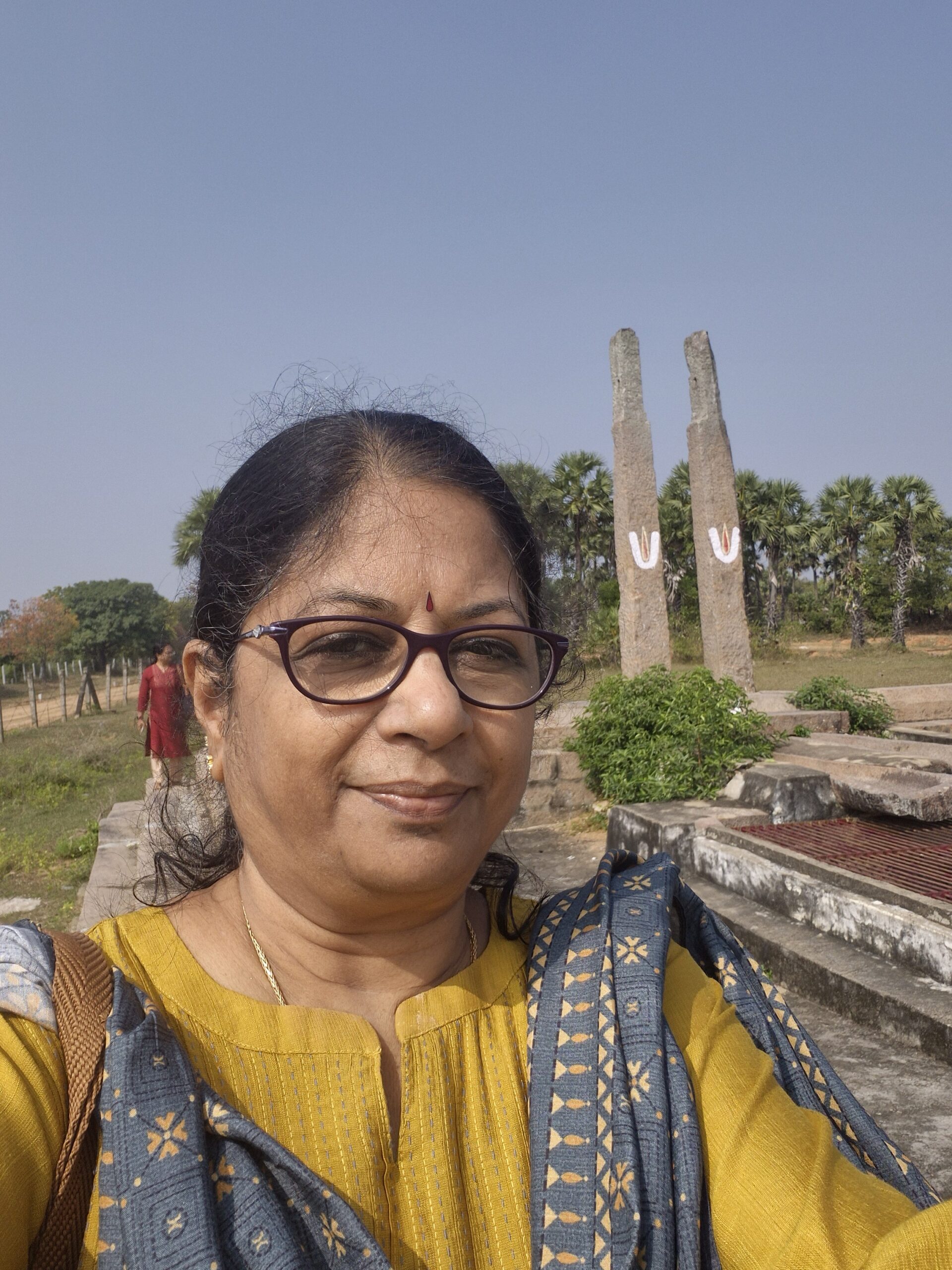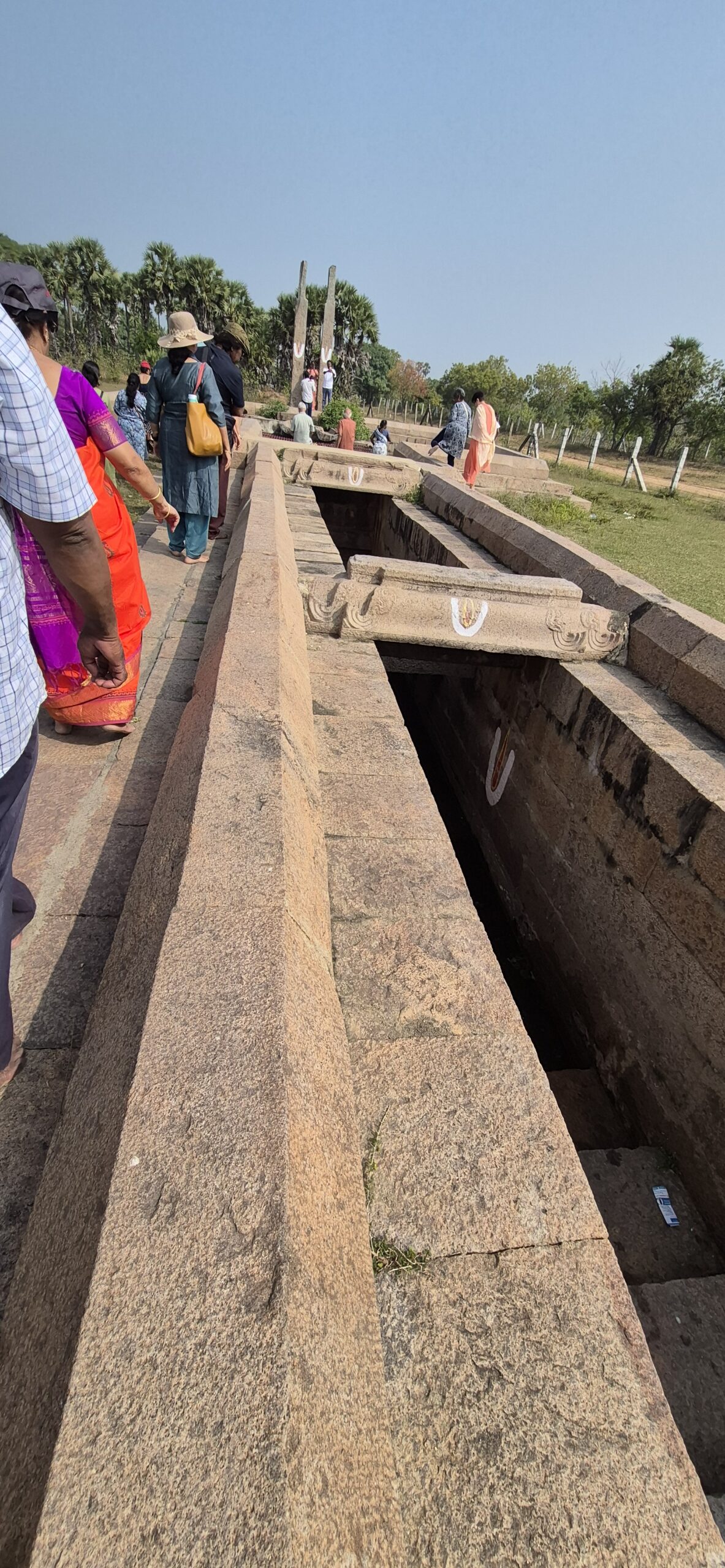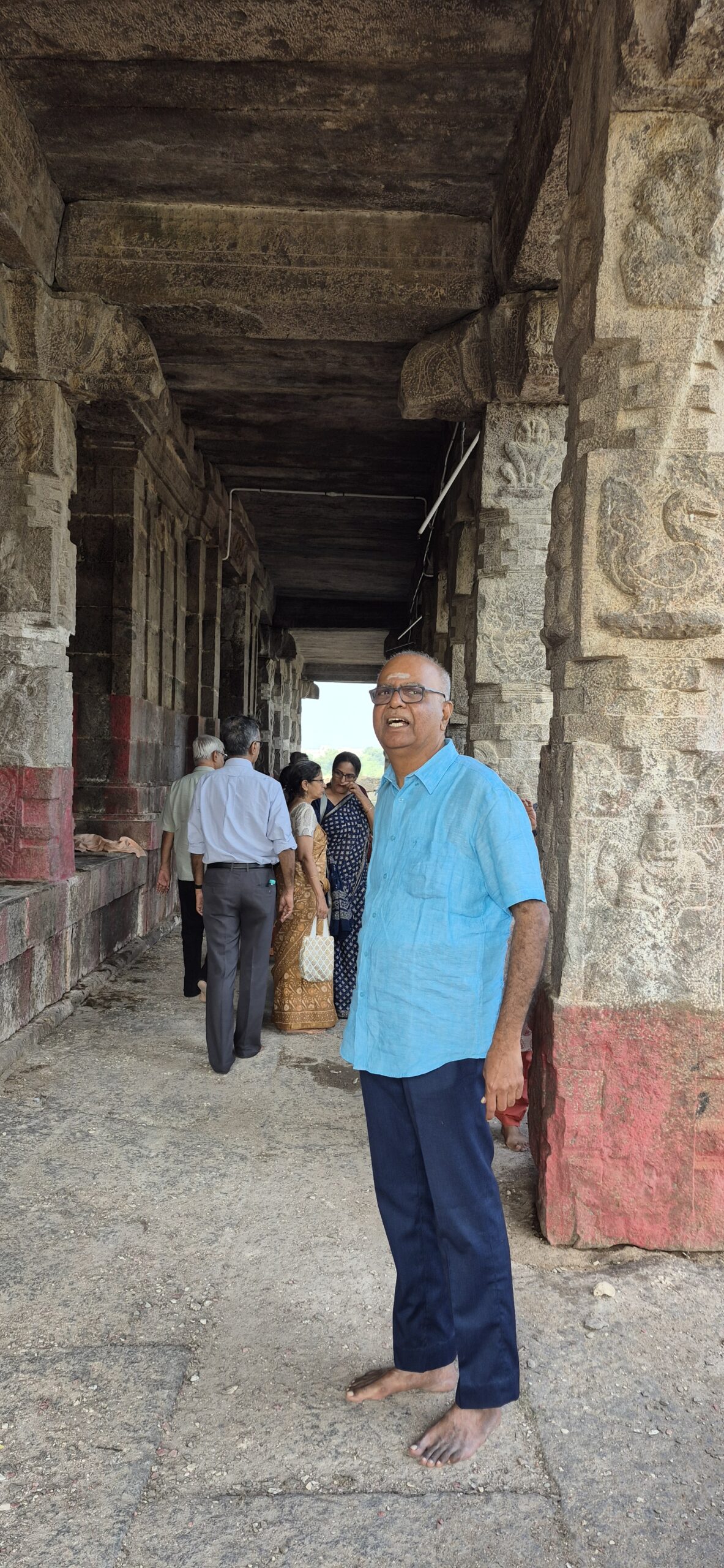 On the other side of the temple stood magnificent carved pillars. Restoration work was underway. Lakshmi Kumara Thathachariyar had also constructed a vast tank/lake — measuring nearly 150 acres — called Lakshmi Saras or Thatha Samudram. We climbed up the mandapam and there it lay before us — a huge expanse of water shimmering under the morning light. I believe there were exquisite sculptures around the lake as well. We took a group photograph with this majestic backdrop.