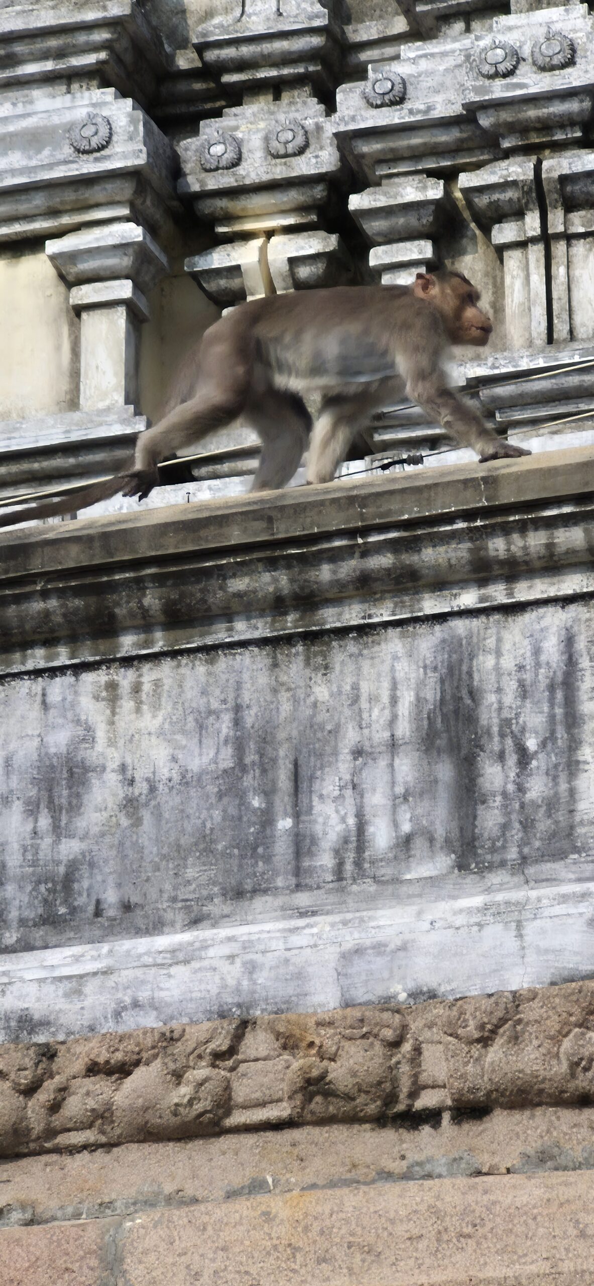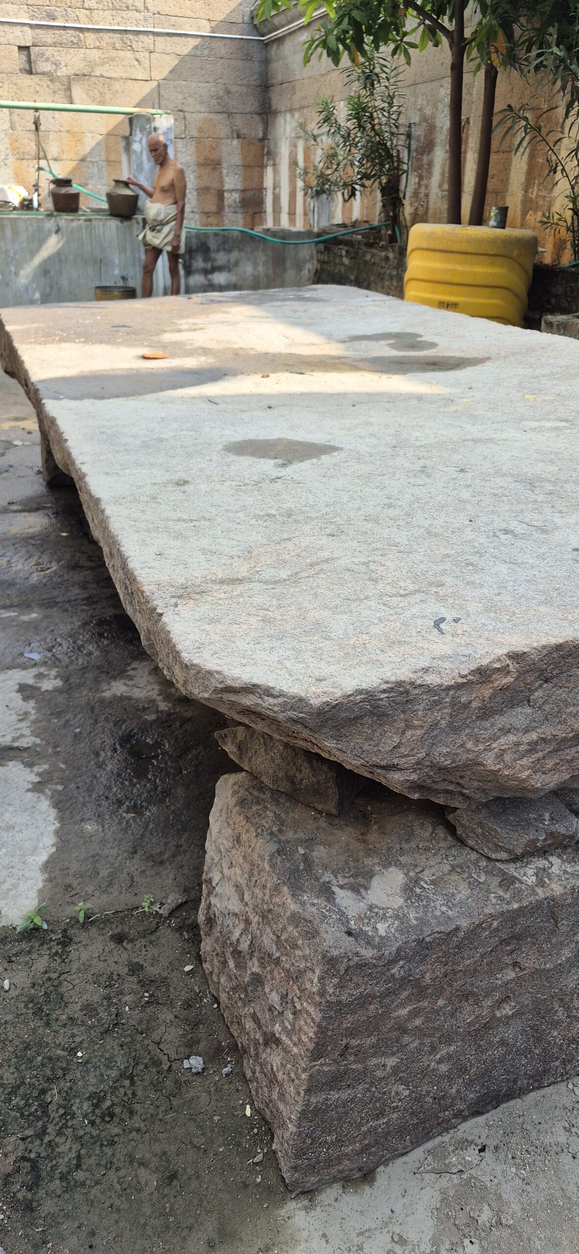 Nearby, we noticed a massive granite slab probably used for cooking. Dr Chithra pointed to a iron ring sculpted out of stone in the corner of the stone roof. Monkeys were everywhere, leaping about with complete ownership of the premises. A tall standing Garuda near a Tulasi maadam greeted us as though guarding the sanctity of the space.