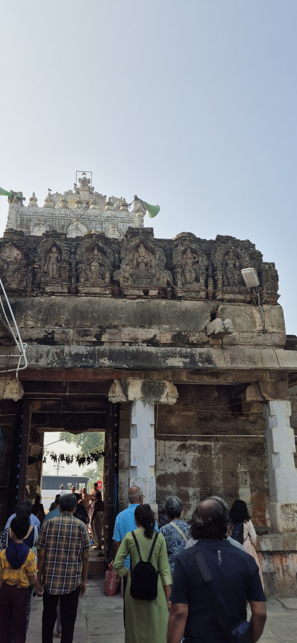 As our bus approached the temple, we realised a local festival was underway. A few cars lined the sides, devotees moved about briskly, and the temple wore a festive air. At the entrance stood a tall four-pillared mandapam. Dr. Chithra remarked that what we were seeing was actually the back of the temple. The main entrance faced a vast lake — which we would eventually see and marvel.