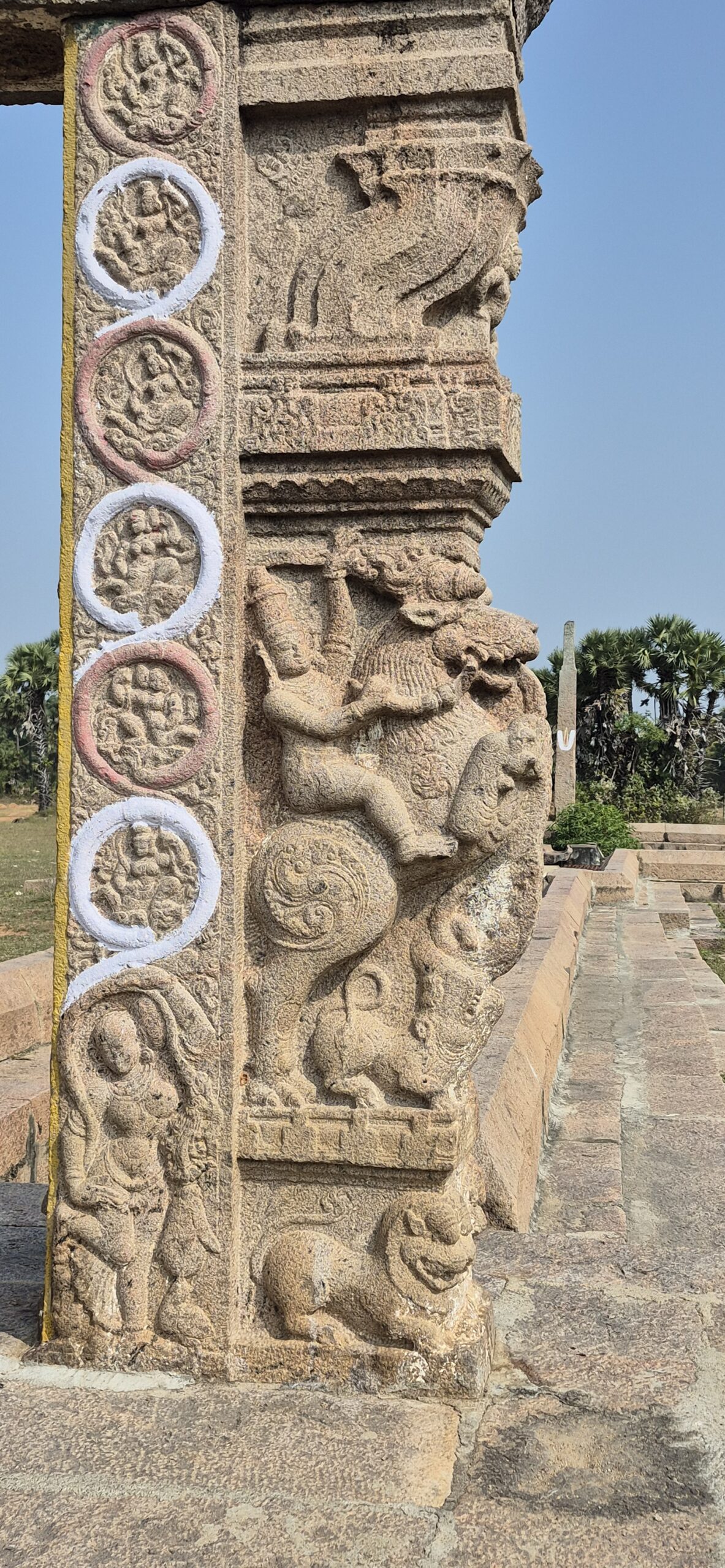 The entrance pillars were works of art. At the top, Gajalakshmi presided benevolently. Flanking the structure were two majestic yālis. Delicate circular panels depicted dancers and musicians. At the base stood the river goddesses Ganga and Yamuna, guardians of purity.